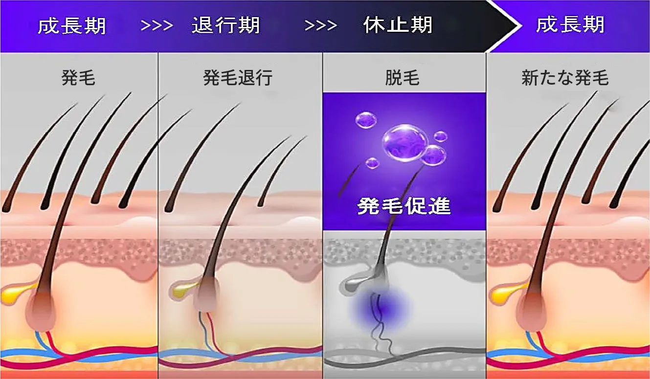 毛包細胞を分化・増殖させることで発毛を促進します。