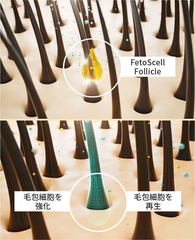 フォリクルには、ヒト幹細胞馴化培養液、NK 細胞馴化培養液エキスに加え、 頭皮を保護するベタイン、トレハロースが配合されています。毛包細胞を分化・増殖させることで発毛を促進し、老化・損傷した毛包を修復・再生し、毛髪を強化します。